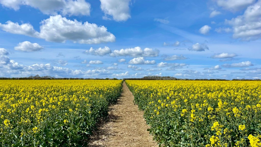 So, how does the conflict relate to the creation? It’s an English agricultural field growing rapeseed crop after all, right? The answer is yes, it is a field of a flowering crop. However, rapeseed crop flowers in yellow, and given the springtime weather, it meant that the reference image and subsequent creation had a yellow foreground and midground, showing the crop, with a blue sky. It also happens to be the same colours and layout as the national flag of Ukraine – which is blue in the top half and yellow in the lower half. The national flag of Ukraine has, since the invasion and subsequent war has begun, become a symbol of solidarity and hope that the conflict will soon be over and Ukraine be a safe place, free from conflict, once more.
